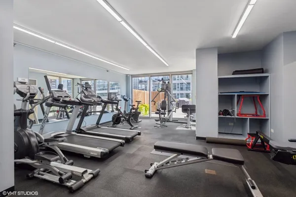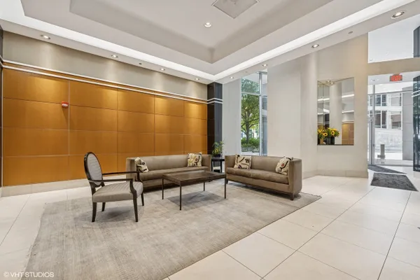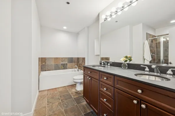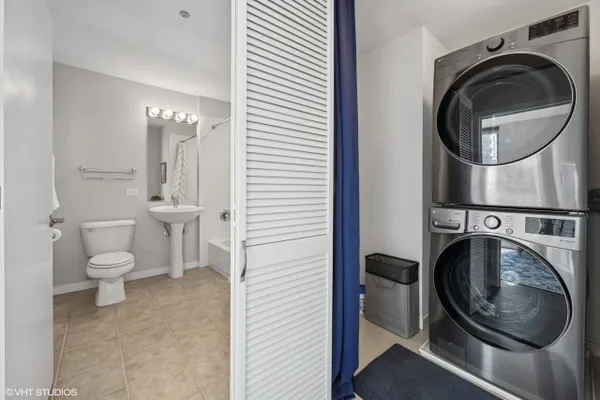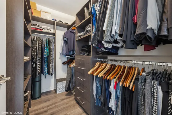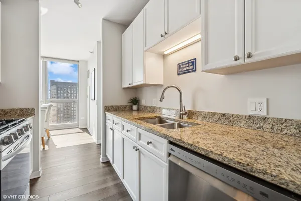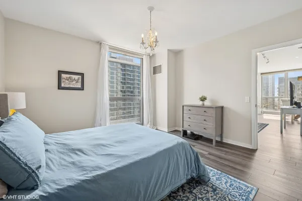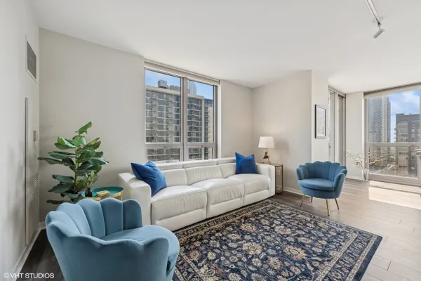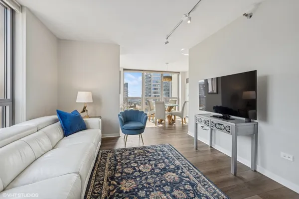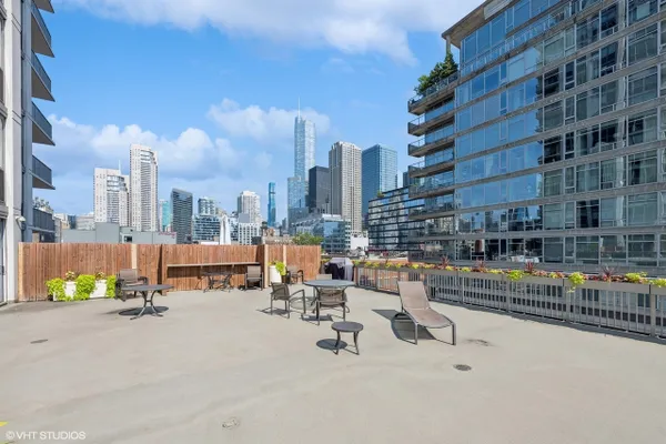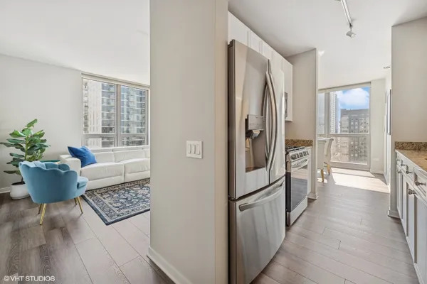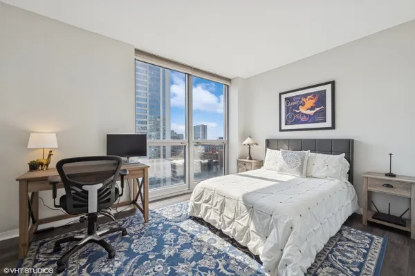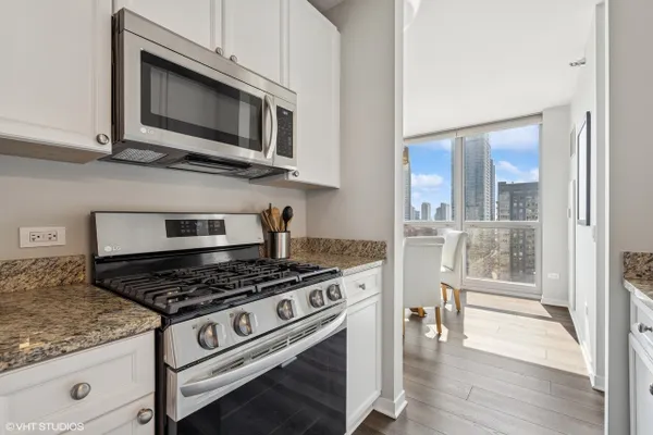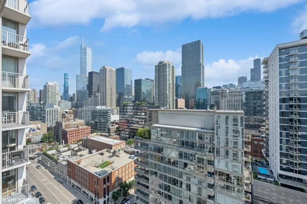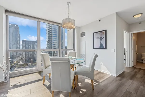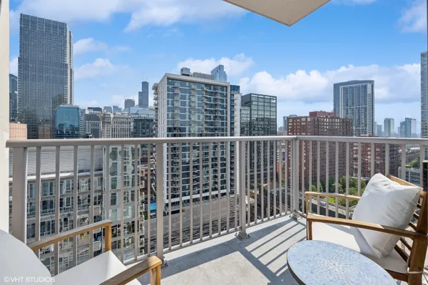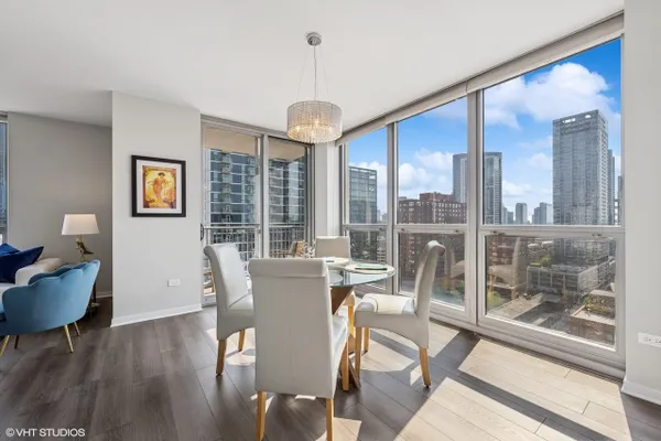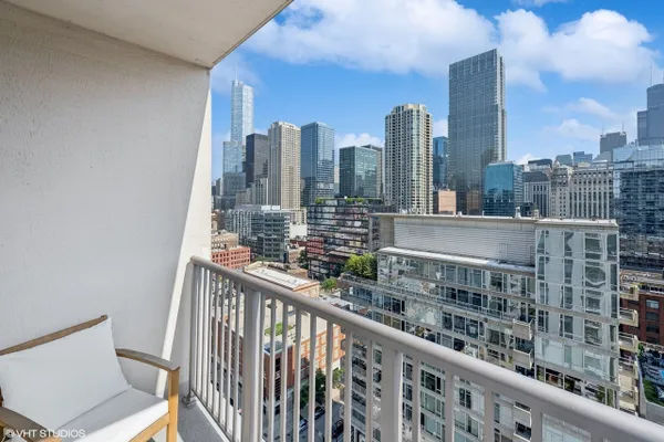Spectacular city views abound in this meticulously maintained corner condo perched on the 18th floor in the heart of River North. This bright and stylish split 2 bedroom, 2 bath home features floor-to-ceiling windows overlooking the Merchandise Mart, Willis Tower, and stunning sunsets. The open concept living and dining areas flow into a white kitchen with classic granite countertops, newer stainless steel appliances, and a sunny breakfast nook. Recently refreshed with newer vinyl plank flooring and fresh paint, this move in ready unit feels sharp and modern. The spacious primary suite boasts a massive professionally organized walk-in closet and a large ensuite bath with dual sinks, a soaking tub, and a separate shower. The guest bedroom offers an entire wall of closet space, perfect for additional storage with room for a home office. Enjoy the convenience of in unit laundry, abundant storage, a private balcony, and attached deeded garage parking for $25k extra. This well managed, pet friendly building offers 24 hour door staff, an on site fitness center, a sundeck, and a brunch restaurant and convenience store are right out front! Assessments include heat, air conditioning, gas, cable TV, and WiFi. Just steps to world class restaurants (hot spot Zarella is across the street!), grocery stores, shopping, transit, East Bank Club, dog parks, and a short stroll to the lakefront and riverwalk.