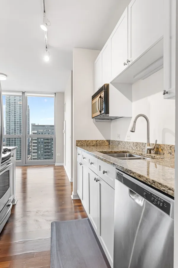 Enjoy sweeping city views from this high-floor 2-bedroom, 2-bath split floor plan condo in an unbeatable River North location. South-facing floor-to-ceiling windows flood the open living space with natural light, creating a bright and inviting atmosphere from morning to night. The open kitchen is outfitted with granite countertops, stainless steel appliances, and a convenient breakfast bar that flows seamlessly into the separate yet connected living and dining areas, ideal for both everyday living and entertaining. Step directly onto your private outdoor space off the living room to take in the city backdrop. The spacious primary suite features a large walk-in closet and an en-suite bath with double vanity, separate shower, and soaking tub. A generously sized second bedroom and full second bath complete the thoughtful split layout. In-unit washer and dryer add everyday convenience. One garage parking space available for $25,000. Full-amenity building with 24-hour door staff, fitness center, and sundeck. Monthly HOA includes heat, air conditioning, gas, water, internet, DirectTV, and doorman service. All of this just steps from River North's dining, shopping, nightlife, and easy transportation. City living exactly where you want to be.